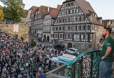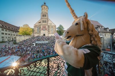 Mittlerweile ist der Empfang im Rathaus für die Schwäbisch Hall Unicorns eine lieb gewonnene Tradition. Seit 2011 sind sie zum achten Mal dort. Die Stimmung ist ungezwungen, selbst Oberbürgermeister Hermann-Josef Pelgrim verzichtet auf allzu förmliche Kleidung, trägt unter seinem Jacket ein grünes Unicorns-Shirt. Auf dem Marktplatz genießen rund 1200 Fans die Abendsonne, das Freibier und die Ein-Euro-Würste. Besseres Wetter gab es bei einem Unicorns-Empfang noch nie. Doch eine bessere Stimmung, vor allem bei den Spielern, sehr wohl.