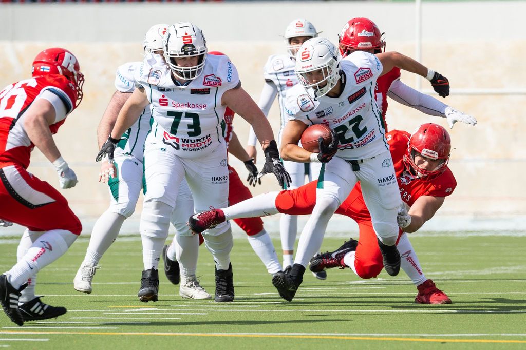 „Ich habe einen guten Eindruck davon, wie weit unser Team jetzt schon ist“, sagte ein zufriedener Head Coach Jordan Neuman am Samstag in Helsinki. Er hatte zuvor ein Testspiel seiner Mannschaft gesehen, in dem sie ihre Gegner in allen vier Vierteln beherrschte. Am Ende stand ein verdienter 46:0-Erfolg, der nicht zuletzt einer sehr starken Leistung der Haller Offense-Line zu verdanken war.