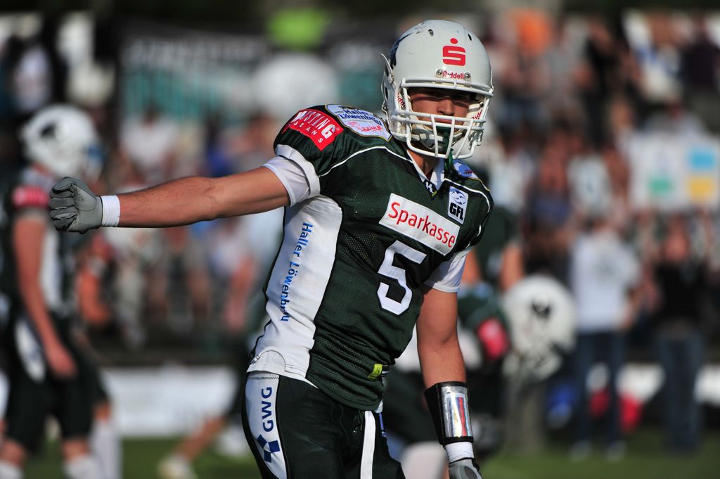 Von nun an zeigten sich die TSGler hellwach und machten sich daran, ihre Gastgeber konzentriert in die Schranken zu weisen. Besonders erfolgreich machte das auf Haller Seite Receiver Felix Brenner. Gleich drei Pässe konnte er am Sonntag in Touchdowns umwandeln und damit 18 Punkte sammeln. Zwei davon sowie weitere Touchdowns von Aaron Boehme und Waldemar Schander (alle Extrapunkte Devincentis) führten zu der klaren Haller 35:7-Halbzeitführung.