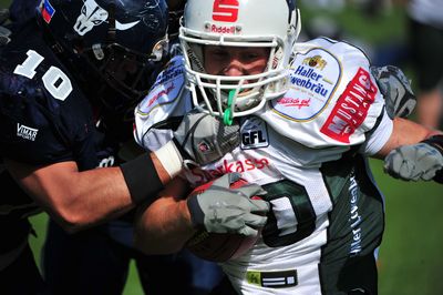 Der schwache Haller Start drückte sich auf der Anzeigentafel nach dem ersten Viertel durch eine nur knappe 7:6-Führung der Gäste aus, für die ein Touchdown von Brian Rushing (PAT Nicolas Robinson) verantwortlich war. Dusty Thornhill und Felix Brenner wurden dann im zweiten Viertel von Biran Brunner mit Pässen bedient, die das 21:7 (PAT Robionson) herstellten. Kurz vor der Pause gelang James Taylor aber noch der Anschluss-Touchdown zum 12:21.