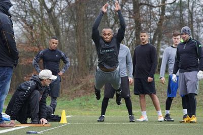 Ab 13:15 Warm Up, danach Combine mit Tests im 40 Yard Dash, 3 Cone Drill, L Drill und Broad Jump absolviert.