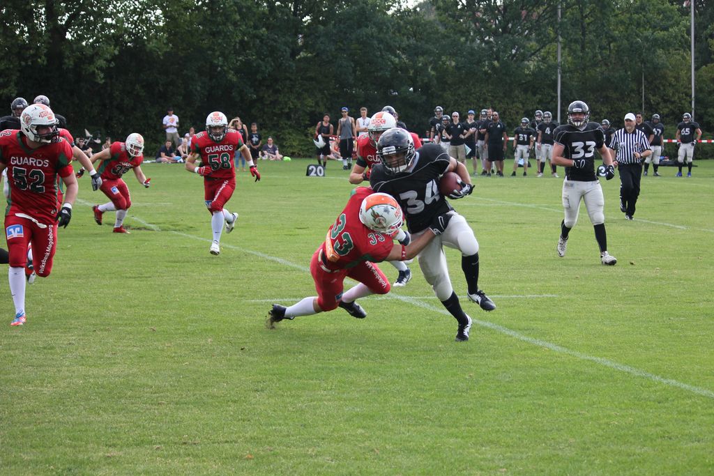 Die Virgin Guards kamen sehr gut in die Partie. Bereits der erste Ballbesitz konnte durch die Offense in Punkte umgesetzt werden. Ein langer Pass von Quarterback Heiko Pittelkau (#20) auf Wide Receiver Mike Dorowski (#80) brachte den Angriff in eine aussichtsreiche Position. Die verbleibende Distanz zum Touchdown erlief Runningback Marcus Jannaschk (#2). Nach dem Zusatzkick von Allan Sotta (#4) übernahmen die Elbestädter die Führung mit 7:0.
