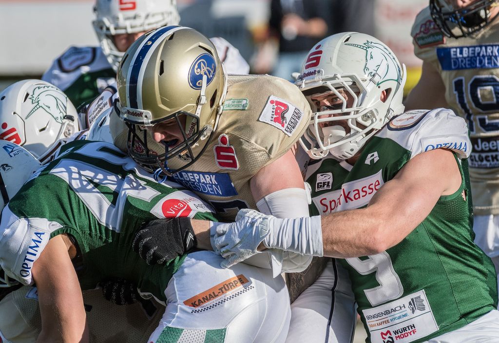 Die Dresden Monarchs haben ihr Viertelfinalspiel am Sonntag gewonnen: Mit 39:22 besiegten sie zuhause die Marburg Mercenaries und ziehen damit ins Halbfinale gegen die Schwäbisch Hall Unicorns ein. Nach 2014, 2015, 2016 und 2018 kommen die sächsischen Monarchen also zum fünften Mal zur Entscheidung um den Einzug in den Germanbowl nach Schwäbisch Hall.